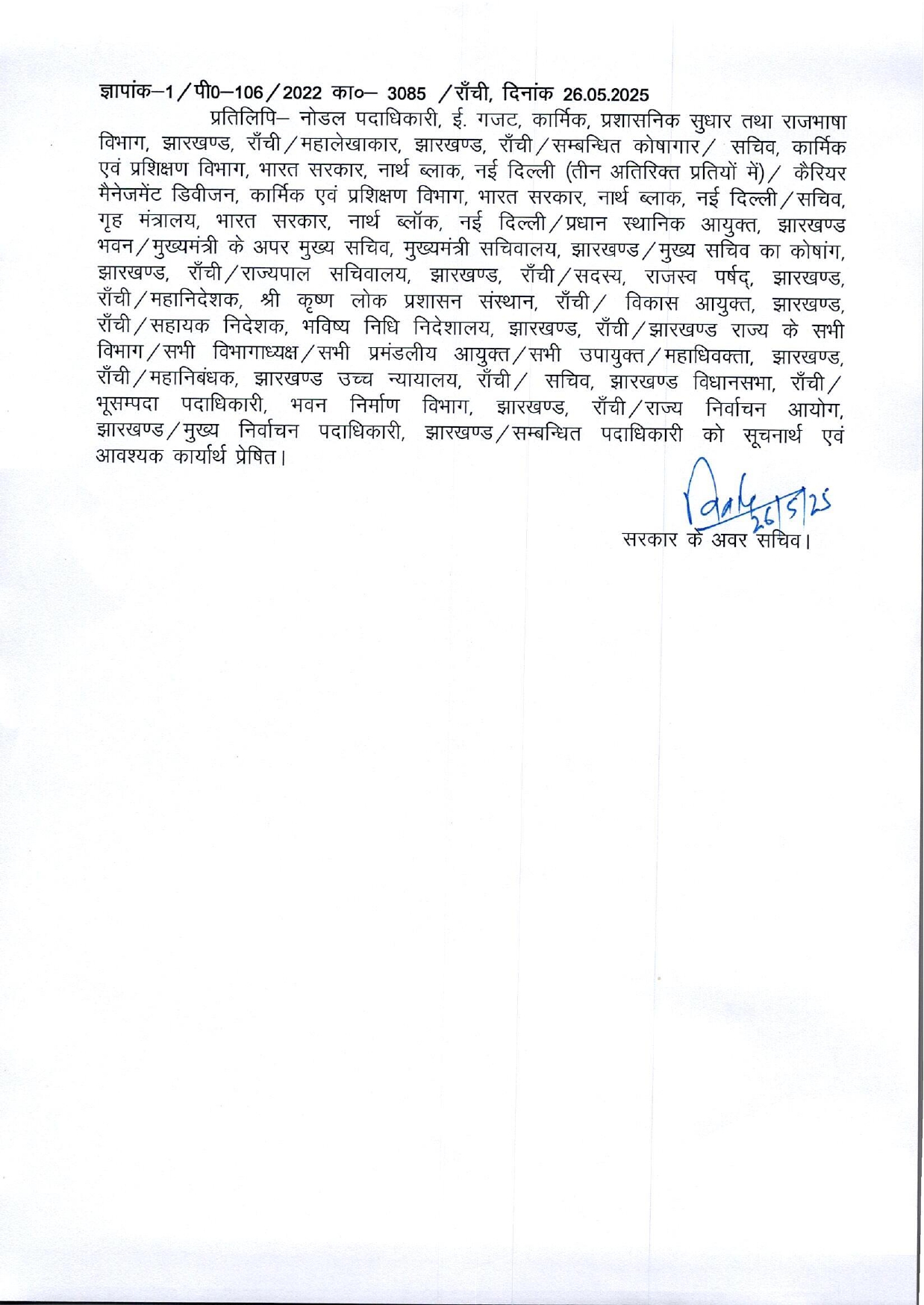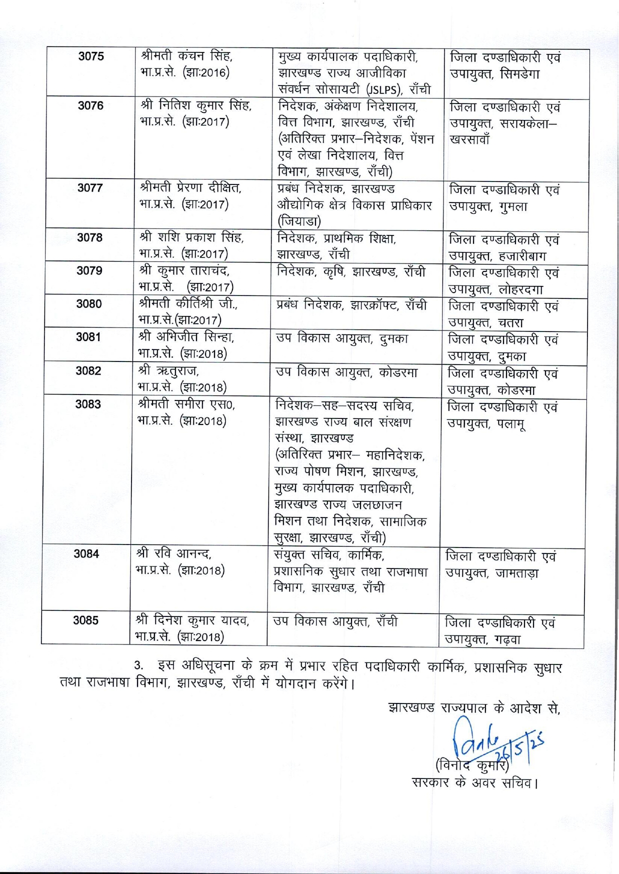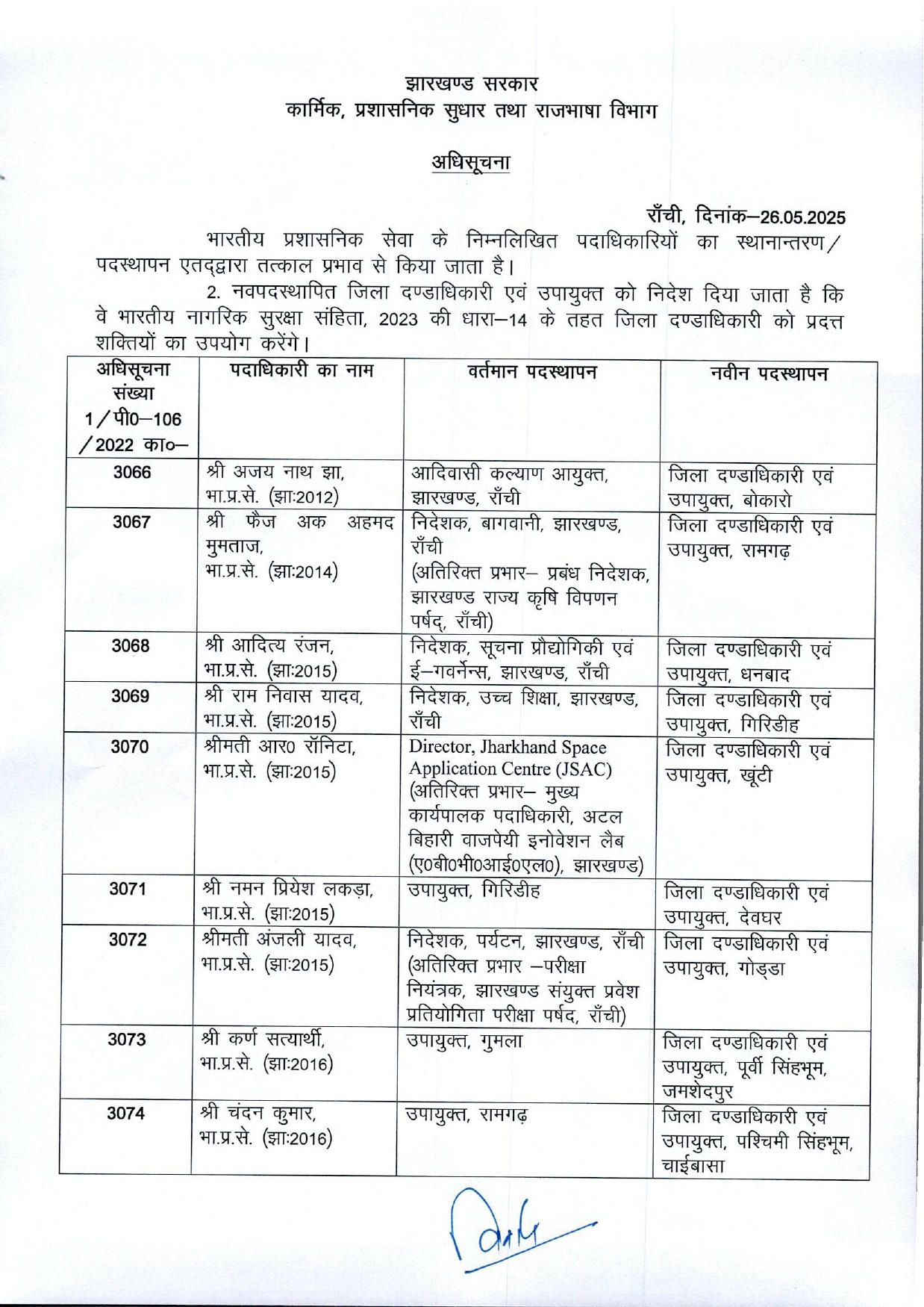 बोकारो, 26 मई 2025: झारखंड सरकार ने भारतीय प्रशासनिक सेवा (IAS) के अधिकारियों के स्थानांतरण/पदस्थापन की अधिसूचना जारी कर दी है। इसके तहत आईएएस अजय नाथ झा (बैच-2012) को जिला दण्डाधिकारी एवं उपायुक्त, बोकारो के पद पर तत्काल प्रभाव से पदस्थापित किया गया है।