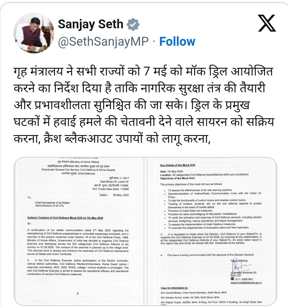 “राष्ट्र की सुरक्षा सर्वोपरि है। गृह मंत्रालय के निर्देशानुसार झारखंड के विभिन्न जिलों में 7 मई को होने वाली मॉक ड्रिल की तैयारी सुनिश्चित की जा रही है। जनता से सहयोग की अपील है—घबराएं नहीं, सतर्क रहें और दिशा-निर्देशों का पालन करें।”